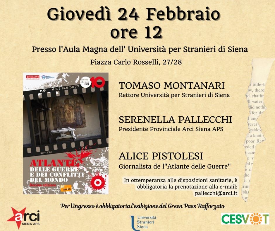 Giovedì 24 febbraio l’Aula Magna dell’Università per Stranieri di Siena, in Piazza Carlo Rosselli, ospiterà la presentazione della decima edizione dell’Atlante delle guerre e dei conflitti del mondo. L’appuntamento, promosso da Università per Stranieri di Siena e Arci Siena aps in collaborazione con il Cesvot, è in programma alle ore 12 e vedrà la partecipazione di Tomaso Montanari, rettore dell’Università per Stranieri di Siena, Serenella Pallecchi, presidente provinciale Arci Siena aps e Alice Pistolesi, giornalista de L’Atlante. Nel rispetto delle norme anti Covid-19 e in virtù di posti limitati, per partecipare è obbligatorio il Green Pass rafforzato e la prenotazione, scrivendo all’indirizzo pallecchi@arci.it.